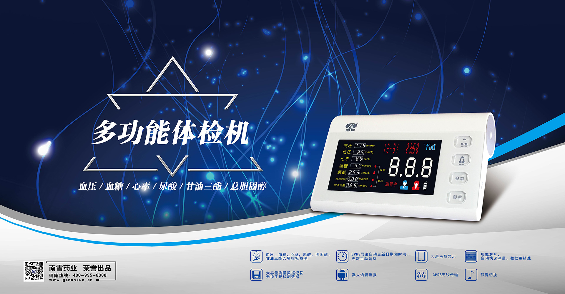 南雪体检机功能强大,集检测六项慢性病指标于一体,高灵敏度,高稳定性,快速准确检测数据,强大的后台系统,实时生成并传输检测数据报告。