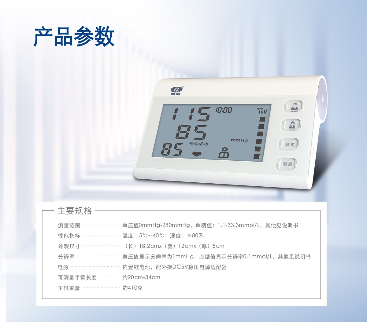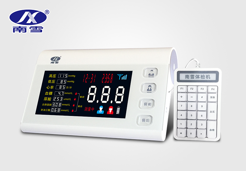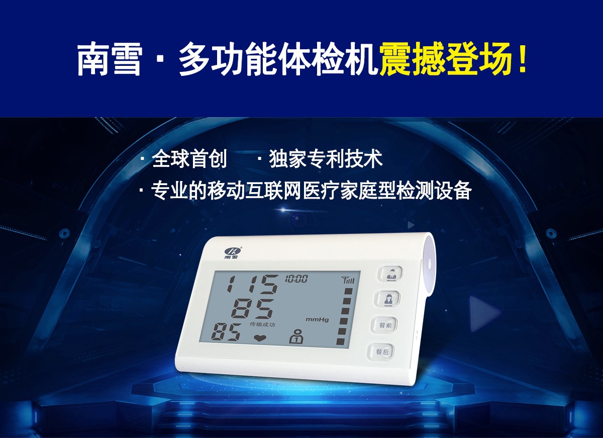 南雪多功能体检机震撼登场; 全球首创,独家专利技术; 六大检测功能【血压、心率、尿酸、血糖、总胆固醇、甘油三酯】; 智能芯片,快速测量精准分析; 数据同步传输,健康图表一目了然; 全程语音导航,真人语音指导辅助操作;
