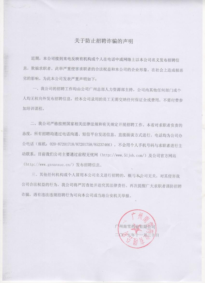 近期,本公司接到来电反映有机构或个人在电话中或网络上以本公司名义发布招聘信息,欺骗求职者。此举严重侵害求职者的合法权益和本公司的企业形象,在社会上造成极恶劣的影响。为此本公司发表严重声明如下: