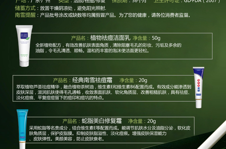 容量:祛痘霜20g、植物祛痘洁面乳50g、修复霜20g