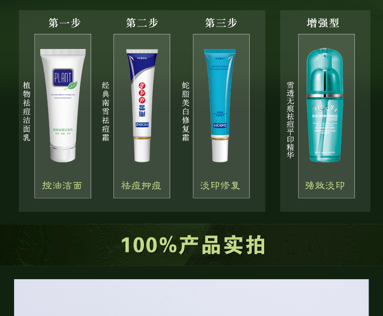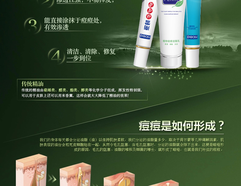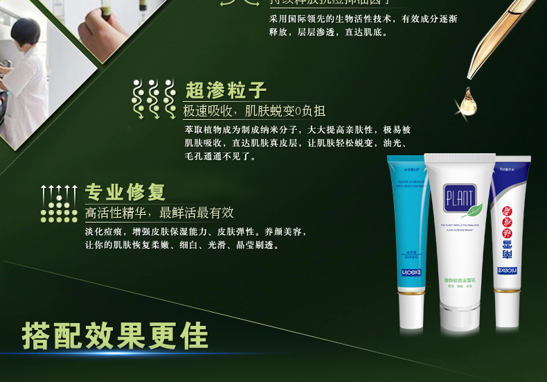 使用方法:早晚用植物祛痘洁面乳清洁后,用爽肤水补水爽肤,再取适量祛痘霜涂在痘痘、粉刺上按摩至吸收,等痘痘粉刺开始消退了涂修复霜。每天使用2-4次。